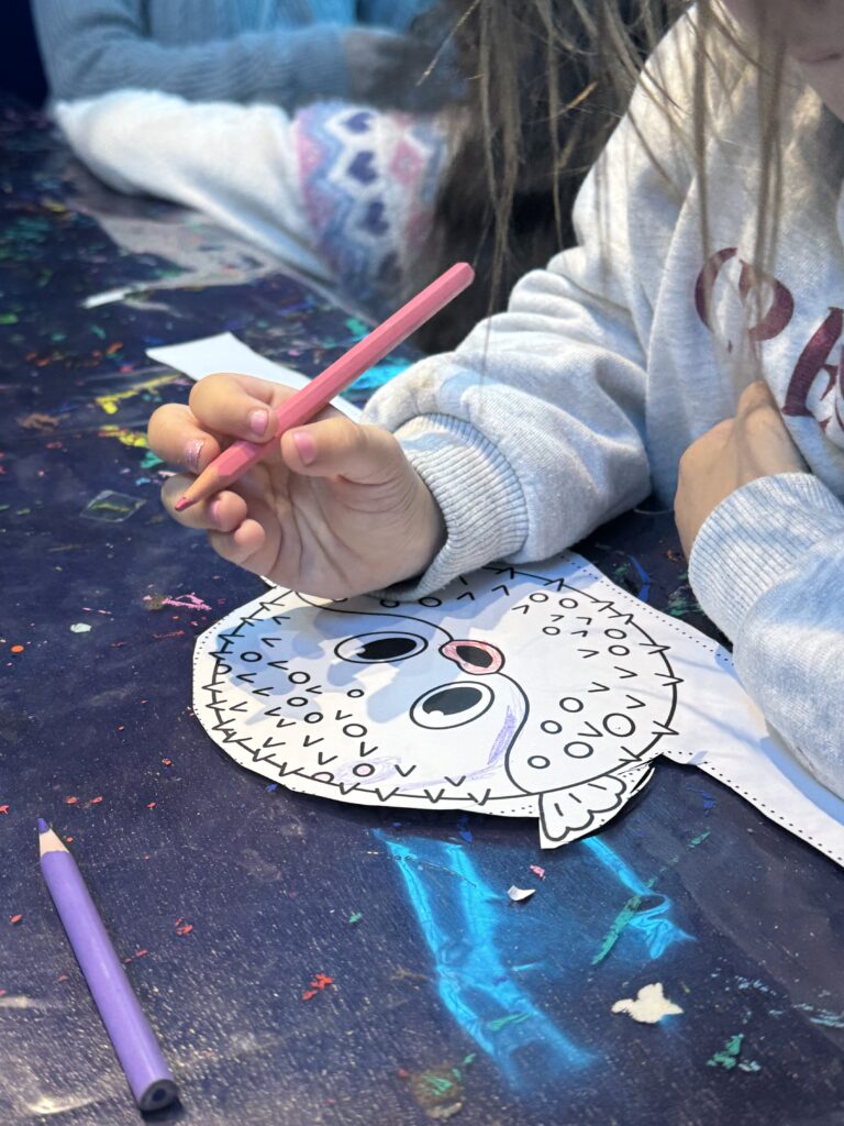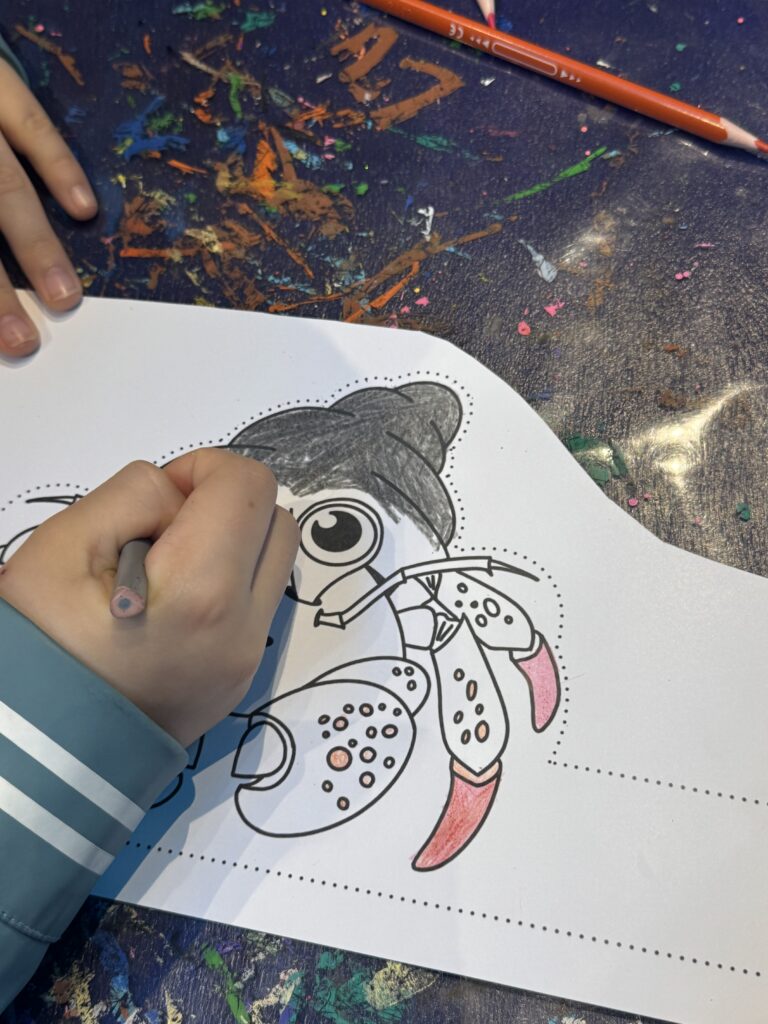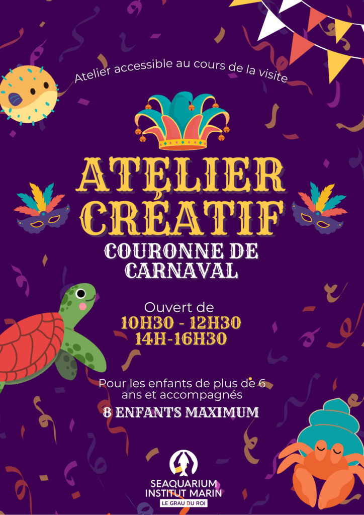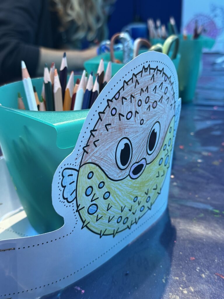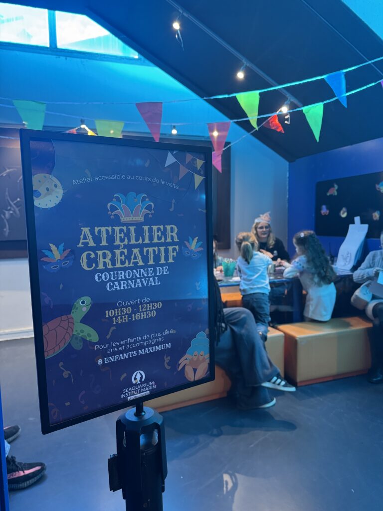 Les enfants réalisent leur couronne inspirée des espèces marines, dans un espace décoré aux couleurs du Carnaval près du requinarium.
