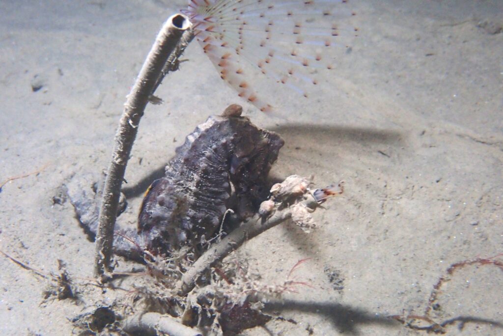 Autre observation forte de la soirée : la présence de nombreux hippocampes à museau court (Hippocampus hippocampus), parfois installés entre les panaches des spirographes (Sabella spallanzanii). Leur abondance hivernale constitue un indicateur intéressant pour suivre l’évolution de cette espèce sensible, étroitement liée aux habitats sablo-vaseux et régulièrement étudiée par le Seaquarium dans le cadre de suivis naturalistes débutés il y a plus de douze ans.